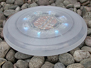 The disc visualizes its rotational speed. It glows blue when nobody is playing. A light throw makes the frispea turn orange and a fast throw turns the frispea red. Frispea demon-strates centrifugal force and creates beautifull traces in the nightsky. patent pending 2003